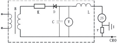 r:分流器 B:試驗變壓器 V:靜電電壓表 CRO:高壓示波器